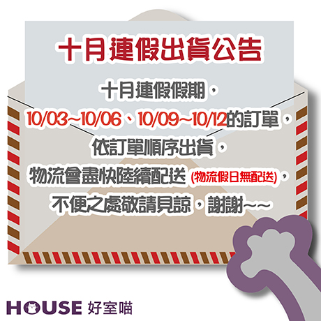 十月連假公告 十月連續假期,10/03~10/06、10/09~10/12的訂單, 依訂單順序出貨, 物流會盡快陸續配送(物流假日無配送), 不便之處敬請見諒,謝謝~~
