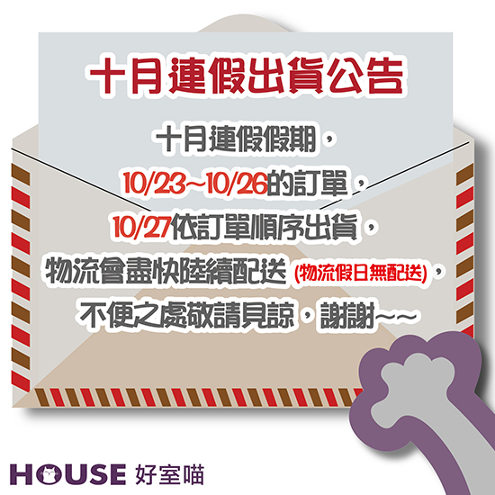 十月連假公告 十月連續假期,10/23~10/26的訂單, 10/27依訂單順序出貨, 物流會盡快陸續配送(物流假日無配送), 不便之處敬請見諒,謝謝~~